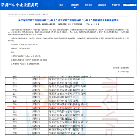 2023年7月21日, 喜报传来,在工业和信息化部组织开展的第五批专精特新“小巨人”企业培育活动中,深圳市深赛尔股份有限公司顺利通过审核及公示。